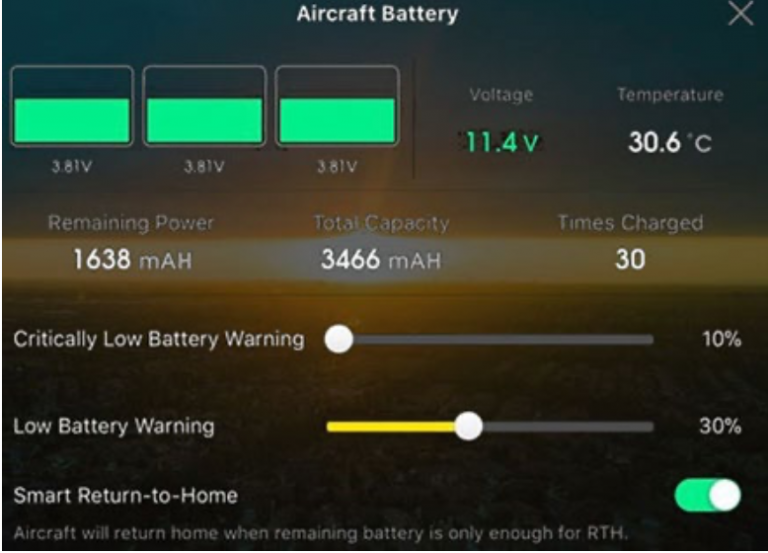 Permite ajustar la sensibilidad de los sensores, la variación de velocidad del motor (el aire frío es más denso), la potencia de la batería y la altitud.