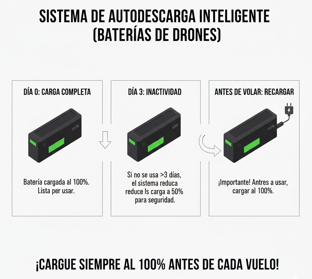 Voltaje Crítico: Nunca descargar por debajo de 3V por celda (daño irreparable). Se recomienda aterrizar al llegar al 15-20% de capacidad.