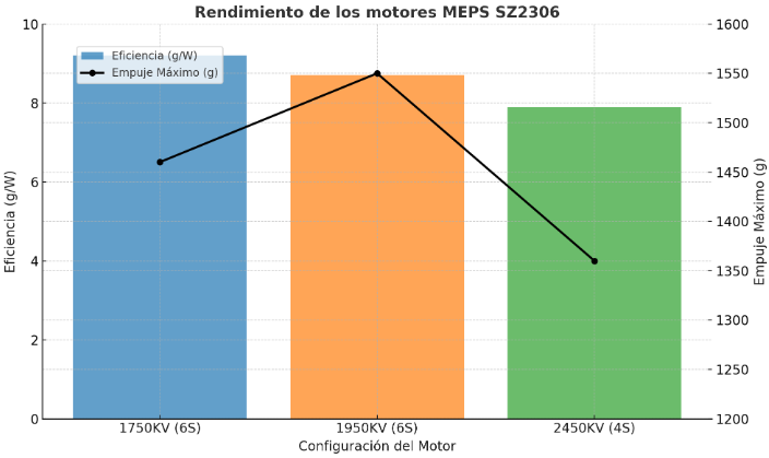 gráfico que muestra el rendimiento de los motores MEPS SZ2306 en términos de eficiencia (g/W) y empuje máximo (g) para las diferentes configuraciones de KV